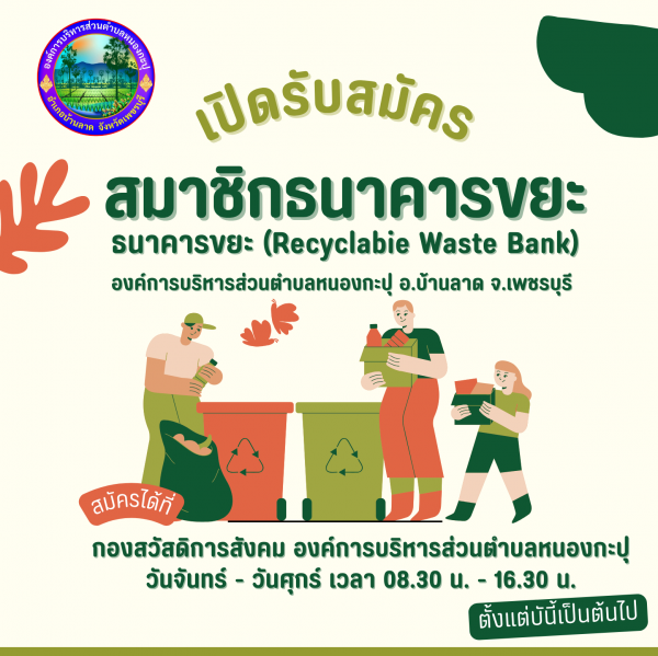 องค์การบริหารส่วนตำบลหนองกะปุ ได้จัดตั้งธนาคารขยะขึ้นเพื่อขับเคลื่อนนโยบายการจัดการขยะมูลฝอยในชุมชน โดยสนับสนุนให้ประชาชนคัดแยกขยะที่ต้นทางภายใต้หลักการ 3Rs คือการใช้น้อยลง การใช้ซ้ำ และการนำกลับมาใช้ใหม่ จึงนำไปสู่การจัดตั้งธนาคารขยะขึ้นมา จึงขอเชิญชวนประชาชน ตำบลหนองกะปุ และตำบลห้วยข้อง เข้าร่วมเป็นสมาชิกธนคารขยะเพื่อสร้างการมีส่วนร่วมในการคัดแยกขยะ