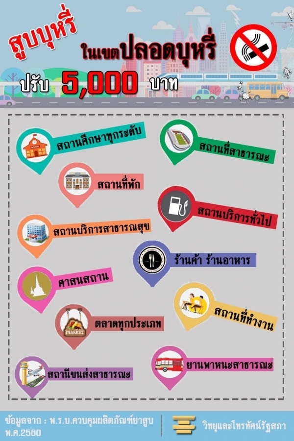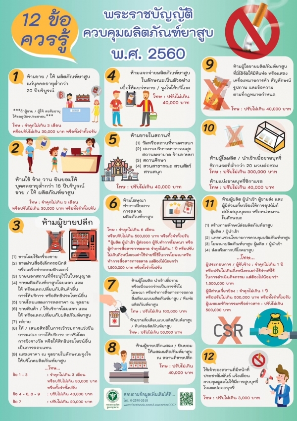 ขอประชาสัมพันธ์เรื่อง พรบ.ควบคุมผลิตภัณฑ์ยาสูบ ปี 2560 / สถานที่ห้ามสูบบุหรี่ / สถานที่ปลอดบุหรี่ตามกฎหมาย / กฎหมายเกี่ยวกับบุหรี่ไฟฟ้า เพื่อเป็นการสร้างการรับรู้และความตระหนักรู้ให้ประชาชนทราบถึงความสูญเสียทั้งทางสุขภาพ เศรษฐกิจ และสังคมที่เกิดจากการสูบบุหรี่