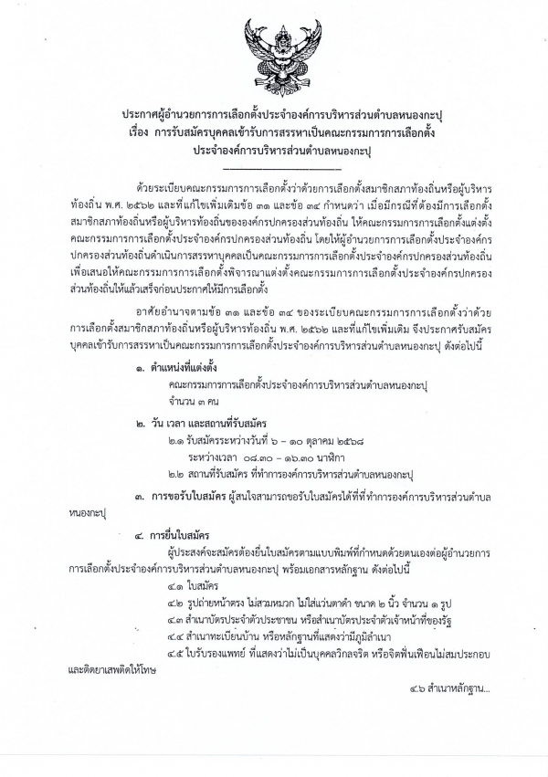 ประกาศผู้อำนวยการเลือกตั้งประจำองค์การบริหารส่วนตำบลหนองกะปุ เรื่อง การรับสมัครบุคคลเข้ารับการสรรหาเป็นคณะกรรมการเลือกตั้งประจำองค์การบริหารส่วนตำบลหนองกะปุ