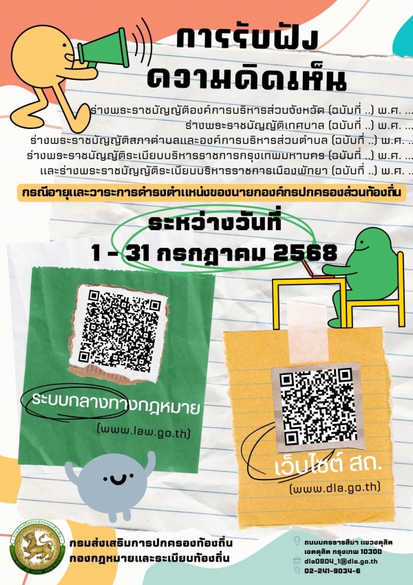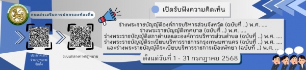 ขอเชิญร่วมแสดงความคิดเห็นต่อร่างพระราชบัญญัติองค์การบริหารส่วนจังหวัด (ฉบับที่ ..) พ.ศ. .... ร่างพระราชบัญญัติเทศบาล (ฉบับที่ ..) พ.ศ. .... ร่างพระราชบัญญัติสภาตำบลและองค์การบริหารส่วนตำบล (ฉบับที่ ..) พ.ศ. .... พระราชบัญญัติระเบียบบริหารราชการกรุงเทพมหานคร (ฉบับที่ ..) พ.ศ. .... และพระราชบัญญัติระเบียบบริหารราชการเมืองพัทยา (ฉบับที่ ..) พ.ศ. .... กรณีอายุและวาระการดำรงตำแหน่งของผู้บริหารท้องถิ่น ตั้งแต่วันที่ 1 กรกฎาคม พ.ศ. 2568 จนถึงวันที่ 31 กรกฎาคม พ.ศ. 2568 ผ่านระบบกลางทางกฎหมาย (www.law.go.th) และทางเว็บไซต์กรมส่งเสริมการปกครองท้องถิ่น (www.dla.go.th)