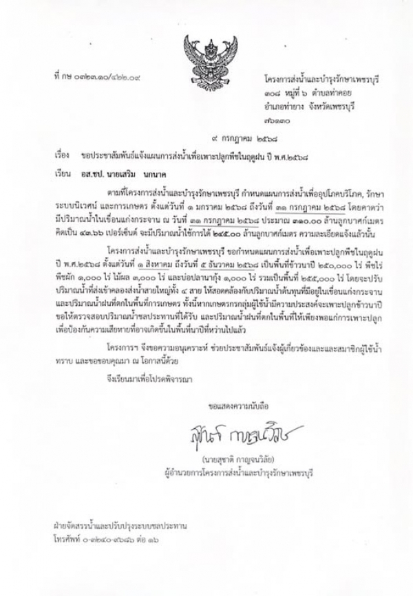 โครงการส่งน้ำและบำรุงรักษาเพชรบุรี ขอกำหนดแผนการส่งน้ำเพื่อเพาะปลูกพืชในฤดูฝนปี พ.ศ.๒๕๖ ตั้งแต่วันที่ ๑ สิงหาคม ถึงวันที่ ธันวาคม ๒๕๖๘ เป็นพื้นที่ข้าวนาปี ๕๐,๐๐๐ ไร่ พืชไร่ พืชผัก ๑,๐๐๐ ไร่