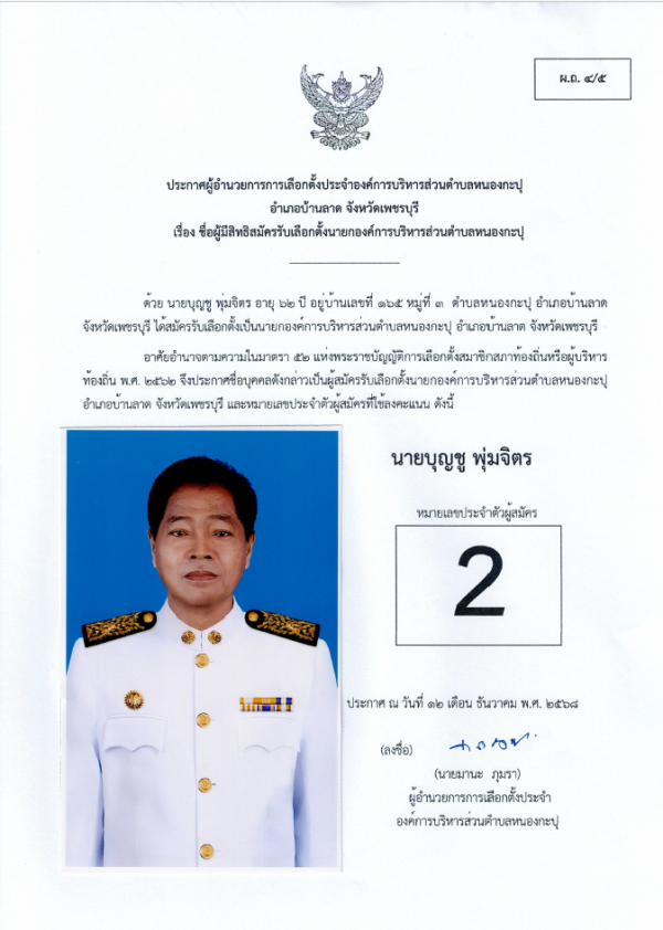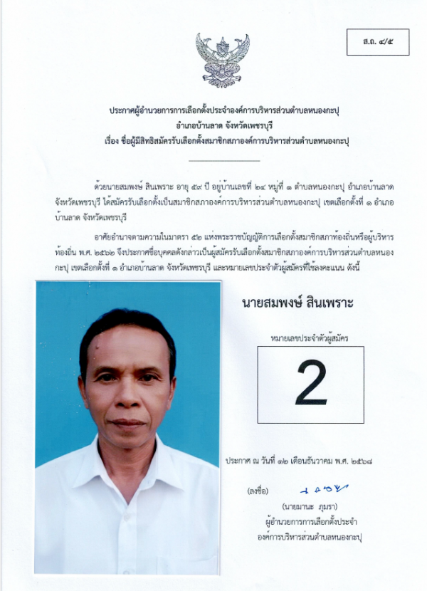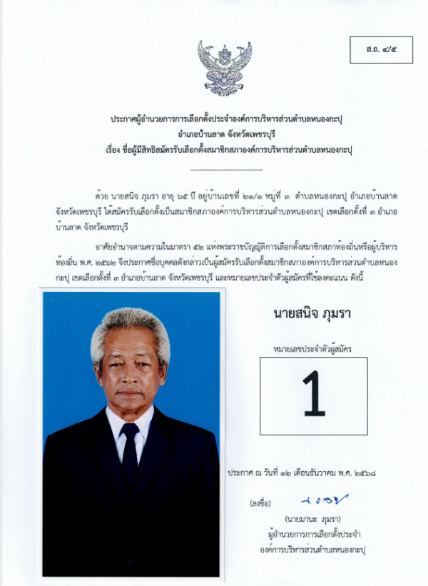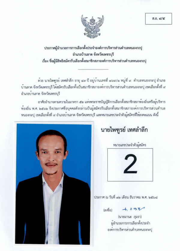 ประกาศรายชื่อผู้สมัครรับเลือกตั้ง สมาชิกองค์การบริหารส่วนตำบลหนองกะปุและนายกองค์การบริหารส่วนตำบลหนองกะปุ ในวันอาทิตย์ที่ 11 มกราคม 2569