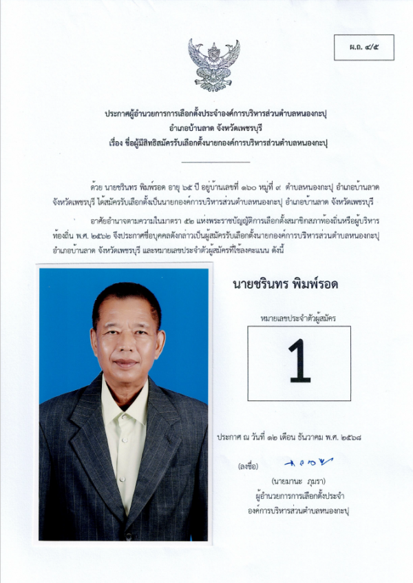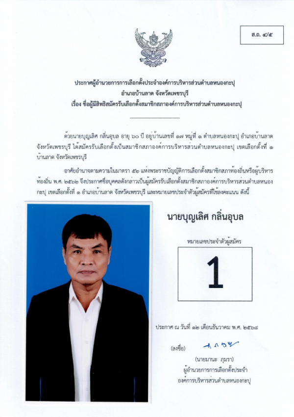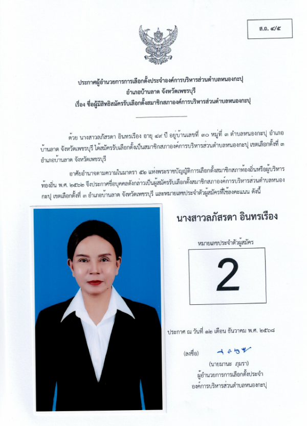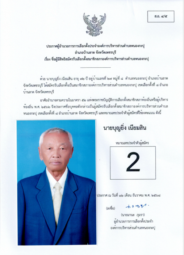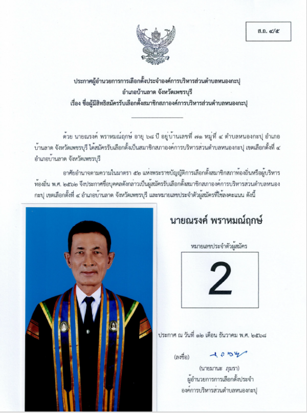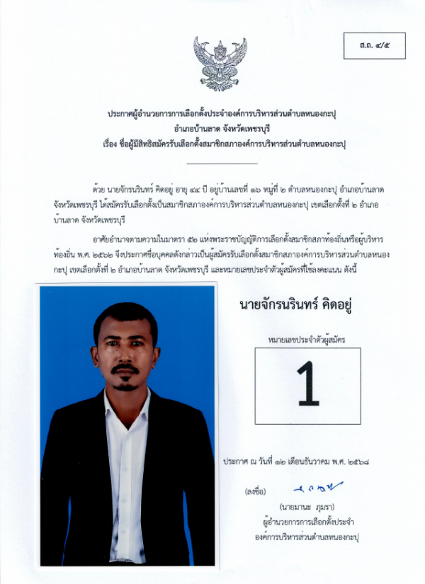 ประกาศรายชื่อผู้สมัครรับเลือกตั้ง สมาชิกองค์การบริหารส่วนตำบลหนองกะปุและนายกองค์การบริหารส่วนตำบลหนองกะปุ ในวันอาทิตย์ที่ 11 มกราคม 2569 นี้