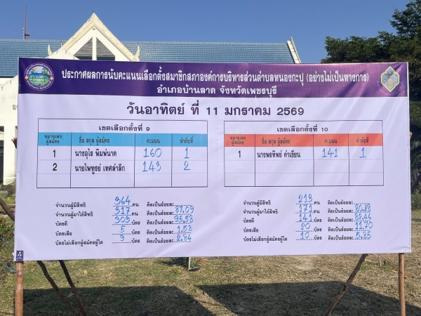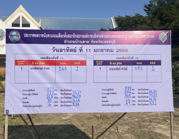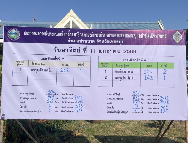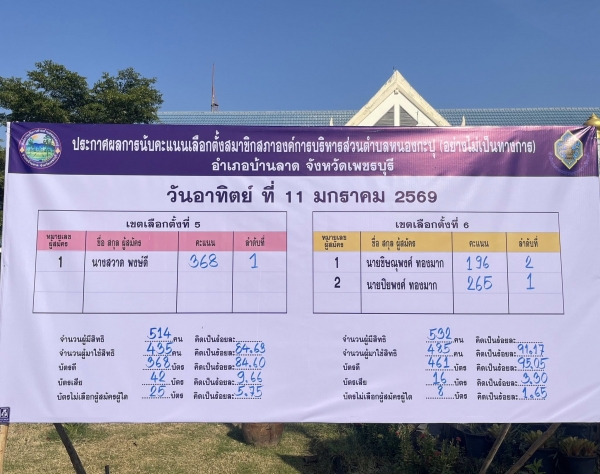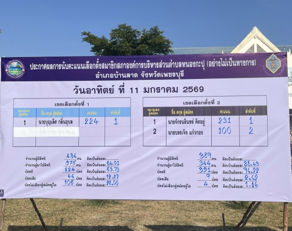 ป้ายประกาศผลคะแนนรับเลือกตั้งสมาชิกสภาและนายกองค์การบริหารส่วนตำบลหนองกะปุ อย่างไม่เป็นทางการ